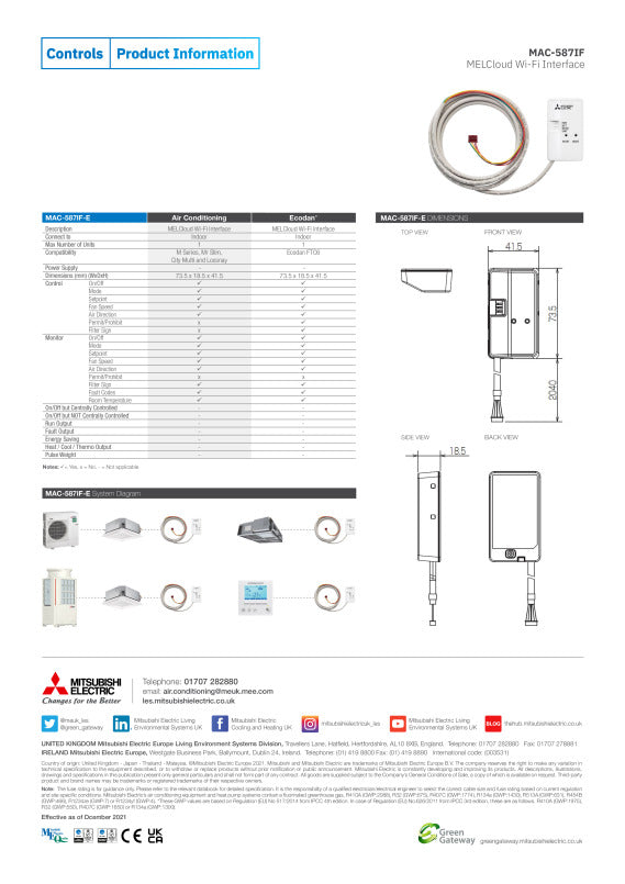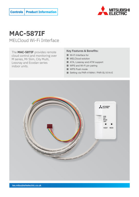 The MAC-587IF provides remote cloud control and monitoring over M series, Mr Slim, City Multi, Lossnay and Ecodan series indoor units.